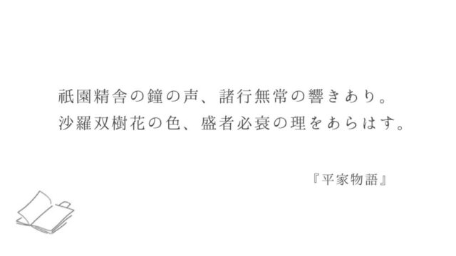 日本文学 祇園精舎の鐘の声、諸行無常の響きあり『平家物語』 意味(現代語訳) 2020年8月27日 キノ 文学の話。 祇園精舎の鐘の声、諸行無常の響きあり 『平家物語』冒頭 〈原文〉 祇園精舎ぎおんしょうじゃの鐘の声、諸行無常の響きあり。沙羅双樹さら …